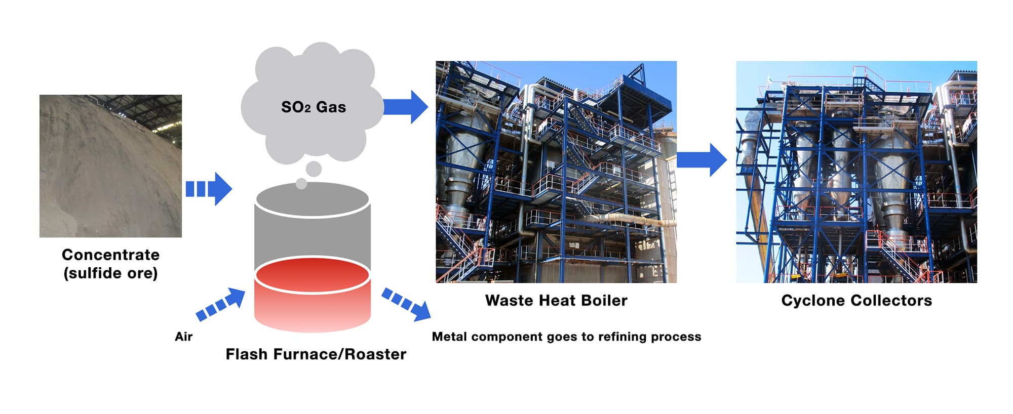 The heat of SO2 gas emitted by concentrate in flash furnaces and roasters is recovered in waste heat boilers, fine particle zinc and copper are collected and transferred to the gas purification process.